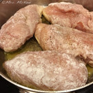 鶏肉は両面に塩コショーして小麦粉をまぶしておきます。