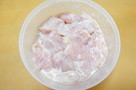 3の鶏むね肉をボールに入れ、酒・砂糖・塩・マヨネーズを加えて揉み込み、10分位置く。(※冷蔵庫で半日位置いてもOK。)