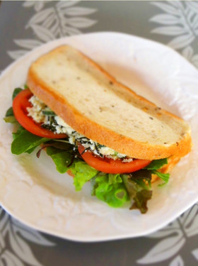 バターを塗ったパンにベビーリーフ、トマト、おからサラダをはさんで出来上がり♪