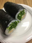 2017年節分・恵方巻き(松葉かに) 今年(2017)の恵方は、北北西。 材料 (1本分) 焼きのり 1枚 酢飯 200g 茹でたかにの身 適量 伊達巻き 細く切ったものを焼きのりの幅分 リーフレタス