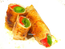 豚薄切り肉を広げ、細い方にスナップエンドウと赤ピーマンを1つずつ乗せる。全体に薄く塩胡椒をして、端から巻く。