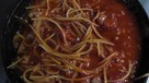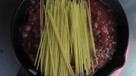 2にトマトの水煮300ccと水100cc、半分に折ったスパゲティを入れます。