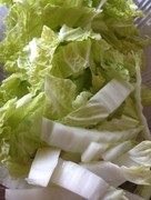白菜は1.5cm巾くらいにカットします。白菜の大きい葉は縦半分にカットしてください。