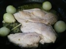 ③鶏肉をひっくり返すタイミングでペコロスを投入。酒も加えて更に弱火で15分蒸し焼きに。