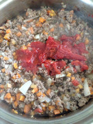 フライパンにバター、みじん切り玉ねぎ人参、挽肉を入れて汁気がなくなるまで炒め、ケチャップとワインを加えます。