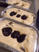 胡桃、ラムレーズンを入れ混ぜる。型に油を塗るか、紙を敷いて、生地を流したら、プルーンを3粒ちょっと埋め込み気味にのせる。