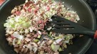 弱火でにんにくを炒め、香りが出たらひき肉を入れます。こげないように気を付けて。