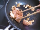 鶏肉の色が変わってくると、たまねぎを加えてしょうゆを振って炒め合わせる