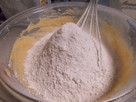 室温で軟らかくしおておいたコンパウンドに、砂糖をすり混ぜ、全卵をぜる。★印を入れる。※印をふるって入れ混ぜる。
