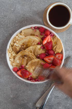 小さめのパンケーキを焼きました。いちご、ラズベリー、ざくろ、ピーナッツバター、ココナッツフレークを添えて。 メープルシロップをかけています⭐️