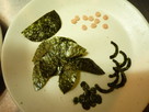 これでパーツは揃いました。あとはラップご飯をはがしてパーツをつけていく。ほっぺにでんぶを少しつけて完成です。