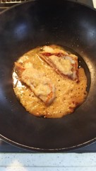 蓋をして5分焼いたらそっと裏返し、漬けていた味噌だれを加えまた蓋をし5分焼きます。