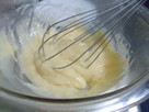 カスタードクリームを作る。耐熱ボウルに卵黄、砂糖を擦り合せ、コーンスターチを混ぜる。豆乳(牛乳)を混ぜる。