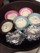 ③にそれぞれプリンをのせ、残りの生地を、隠すように被せる。(よく膨らむので、全体で7〜8分目位の量で!)