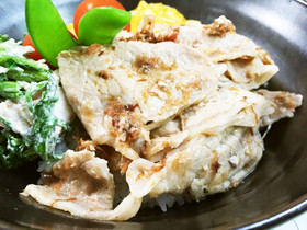 広げたままペーパーをかぶせ、火が通るまで蒸します。ポン酢を回しかけ、おかかをまぶし、肉に汁気を吸わせてできあがり。