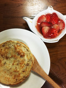 マフィンの上に、イチゴのソースをかけて出来上がり♪