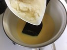 とろりとしてきたら、生クリームを2回に分けて入れ、混ぜ合わせます。
