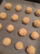 クッキーの生地を直径3㎝位に丸める。生地の片側に白身を付けた後、ヘーゼルナッツを付け、形を整えて天板へ並べる。