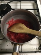赤寒天はサッと洗って、分量の水100ccにちぎって入れて、15分くらい置いておく。