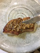 肉を皿にとり、小さじでビンからマスタードをすくって肉に乗せ、ナイフで均一に広げる