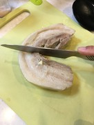 豆が煮えたらフタを開けて放置し、15番の肉野菜の鍋から肉を取り出し、半分に切る