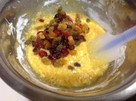 ②に薄力粉、ナッツ、オレンジピール、レーズンなどのドライフルーツ投入‼️ヘラでサックリ混ぜる。