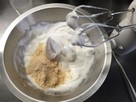 ふわっと泡立ち2倍位のカサになったら、残りの砂糖の半分を加え、高速で泡立てる。