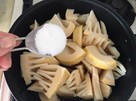たけのこ、本つゆ、水、砂糖を深めの鍋かフライパンに入れます