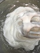 高速でしっかり撹拌し、ハンドミキサーを持ち上げると、ツノがピンと立ちます。しっかりとしたメレンゲを目指してください。