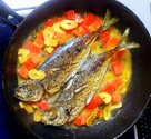 火が通ったら鯵だけお皿に置き、フライパンのトマトを軽く潰し(※)ソースにします。ここで味見をし薄ぃようなら塩を足します。