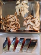 材料です。キノコ類は食べやすい大きさにする。水洗いはしないでください。鯖は食べやすい大きさに切り、塩・こしょうしておく。