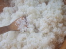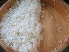 炊き上がって15分程蒸らしたご飯を飯台に空け、合わせ酢を回しかけます。
