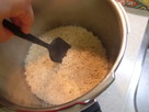 もち米を炊きますが、水は煮物の残り汁で。残り汁と水を足して450mlにして炊きます。圧力鍋なら4分加圧、自然放置。