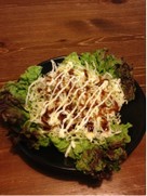 キャベツは千切りにしてレタスを敷いたお皿に半分くらい乗せて、少しマヨとお好みソースをかける。