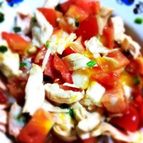 ささみが湯がき終わったら手でさいて、皿に乗せたトマトの上にぱらぱらと散らし、その上に卵を乗せます。