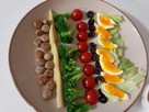 ミニトマトを半分に、ヤングコーンも縦半分に切る。レタスは手でちぎり、ブロッコリーは塩茹で、ゆで卵も作る。
