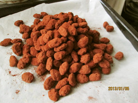 下地のアーモンドが見えなくなるまで続けます。途中でチョコとチョコがくっついてしまうので外したりしてください。