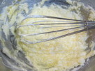 <マフィン生地を作ります>バターを泡立て器でクリーム状に練り、砂糖、卵の順に入れてよく混ぜます