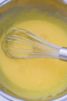 4にグラニュー糖、牛乳、全卵の順に加えて泡立て器で混ぜ合せる。