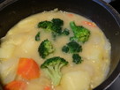 野菜が煮えたらコーンクリームを入れ更に煮詰める。茹でたブロッコリーを入れる。