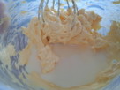 練乳大さじ2杯と洋酒(またはバニラオイル)をその都度良く混ぜながら加えます。※私はラム酒を小さじ2杯加えています。