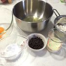 たまごは卵白と卵黄に分ける。全ての材料を計量する。☆印の粉類をふるう。型にシートを敷く。オーブンを170度に余熱スタート