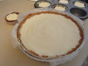 焼いたパイ生地に②を入れて冷蔵庫で固める。完了!(カップケーキの場合は、柔らかめですがすぐでも食べられます)