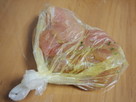 ささみの筋を抜き、ビニール袋に入れる。塩らーめんの粉末スープを入れ、まんべんなくなじむように、よく揉みこむ。