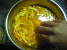 皮を薄く切ります。実は種を取り薄皮をむき、手で潰しておきます。薄皮と種はお茶パックに入れます。