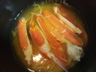 米は研いで30分くらいザルにあげるこんぶつゆ・酒を入れ、2合分の水を入れるだしこんぶを敷きカニ・生姜細切りを入れ炊く