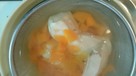 ☆の胸肉、人参茹で用を合わせ、煮立たせる。