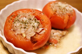 耐熱皿に4で余った具を乗せ、その上に肉詰めトマトを乗せます♪