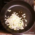 熱したフライパンにオリーブオイル、にんにくのみじん切り、玉ねぎを入れ炒める。
